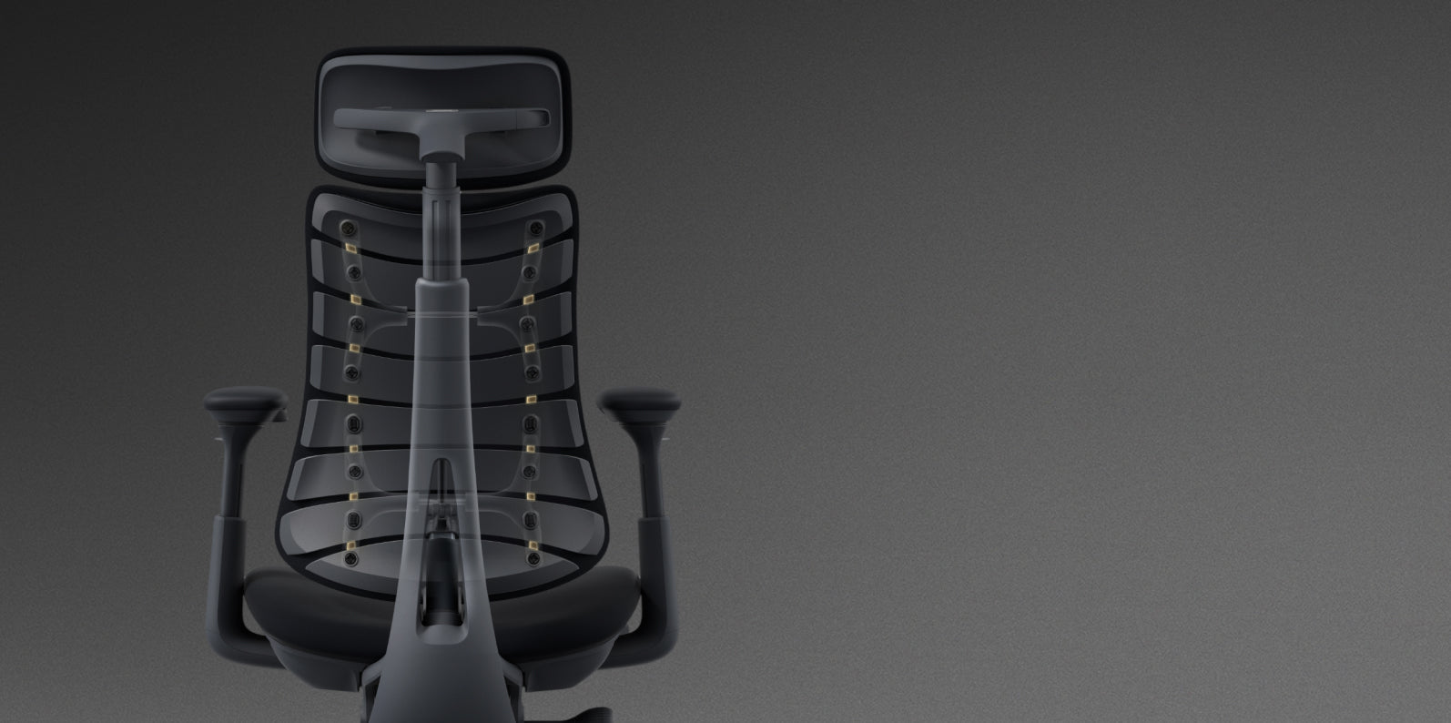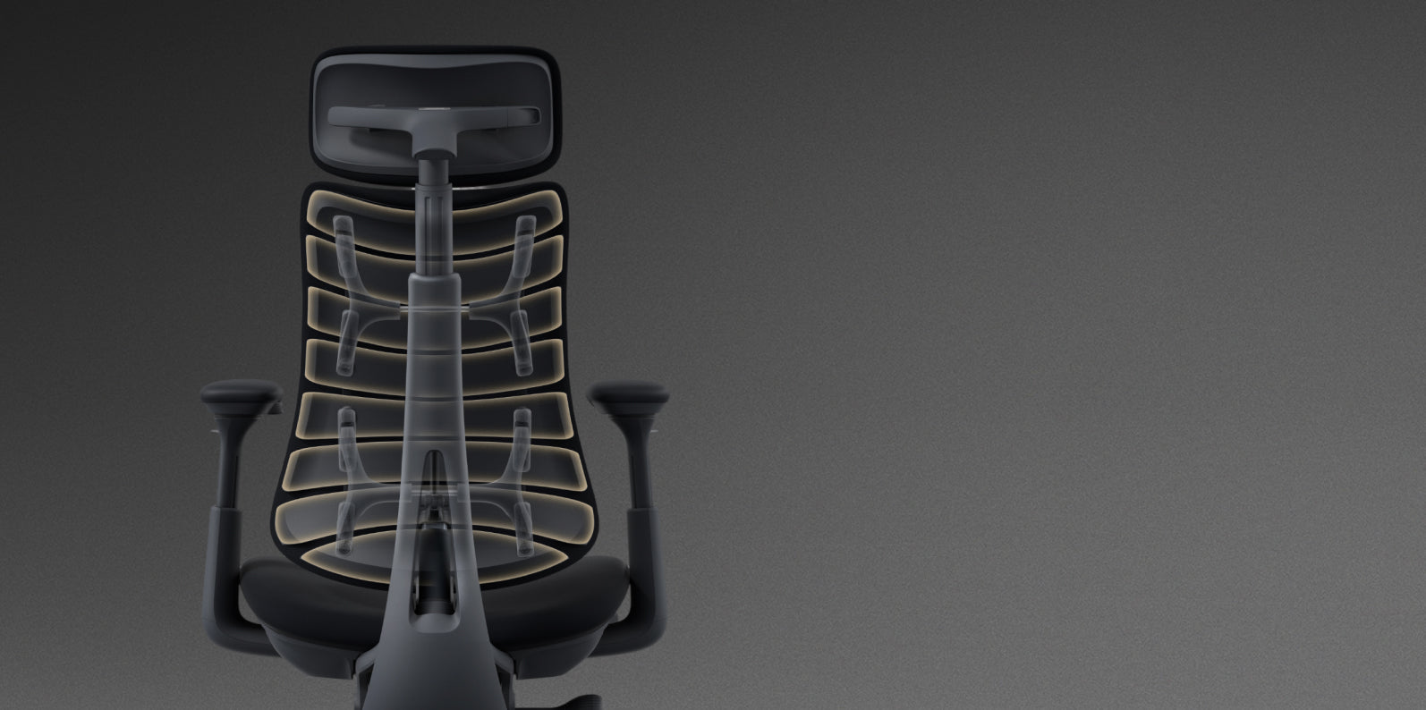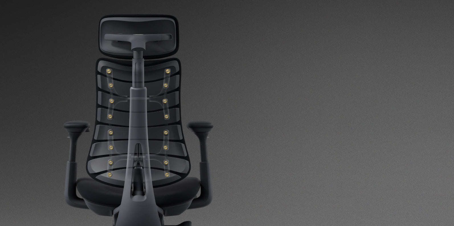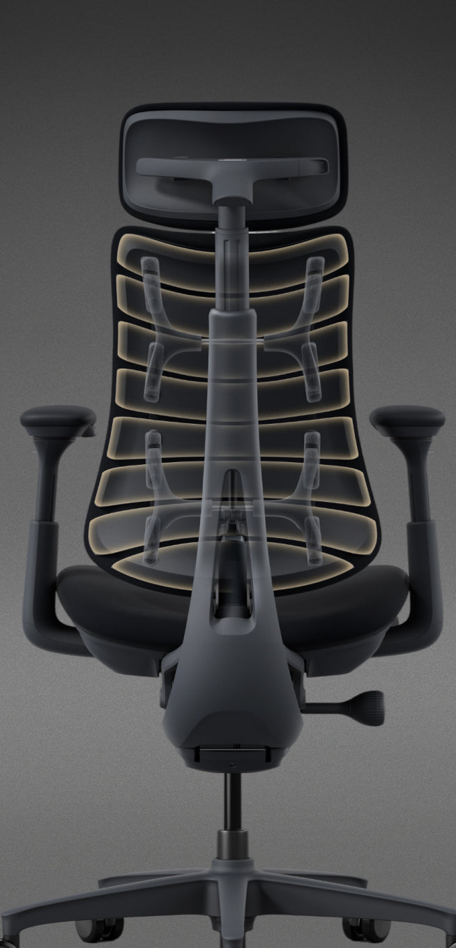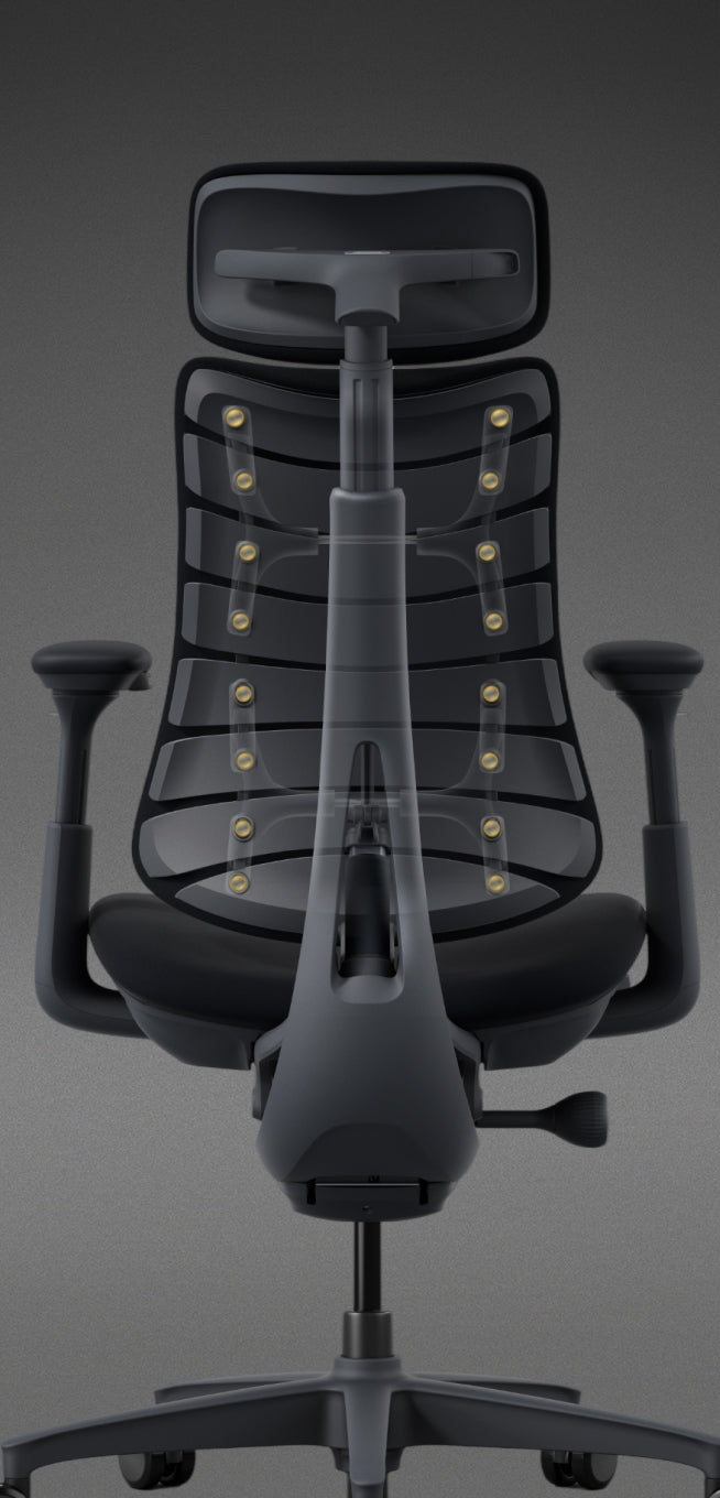 El respaldo cuenta con 8 paneles flexibles conectados por 14 puntos de conexión dual, formando una superficie de soporte dinámica. Equipado con soportes esféricos de doble capa y 16 puntos de pivote, asegura tanto flexibilidad como estabilidad, ofreciendo una alineación personalizada de la columna vertebral con un soporte resistente.